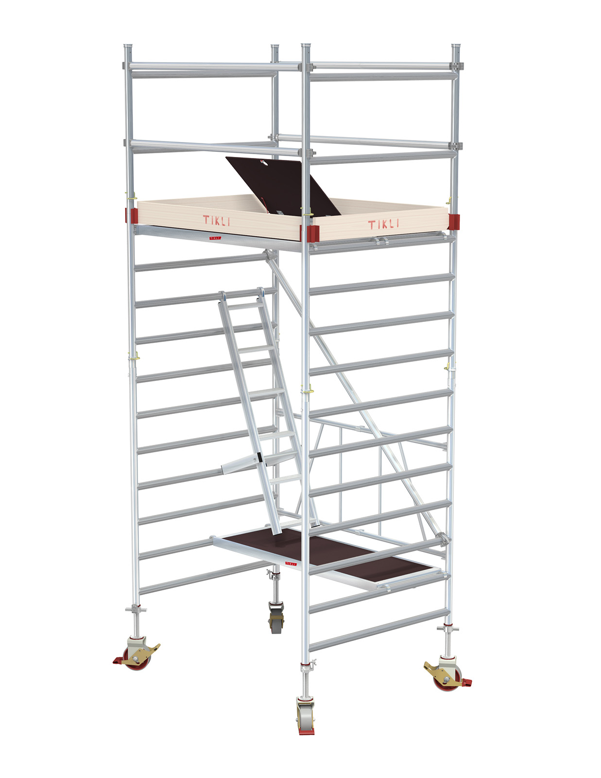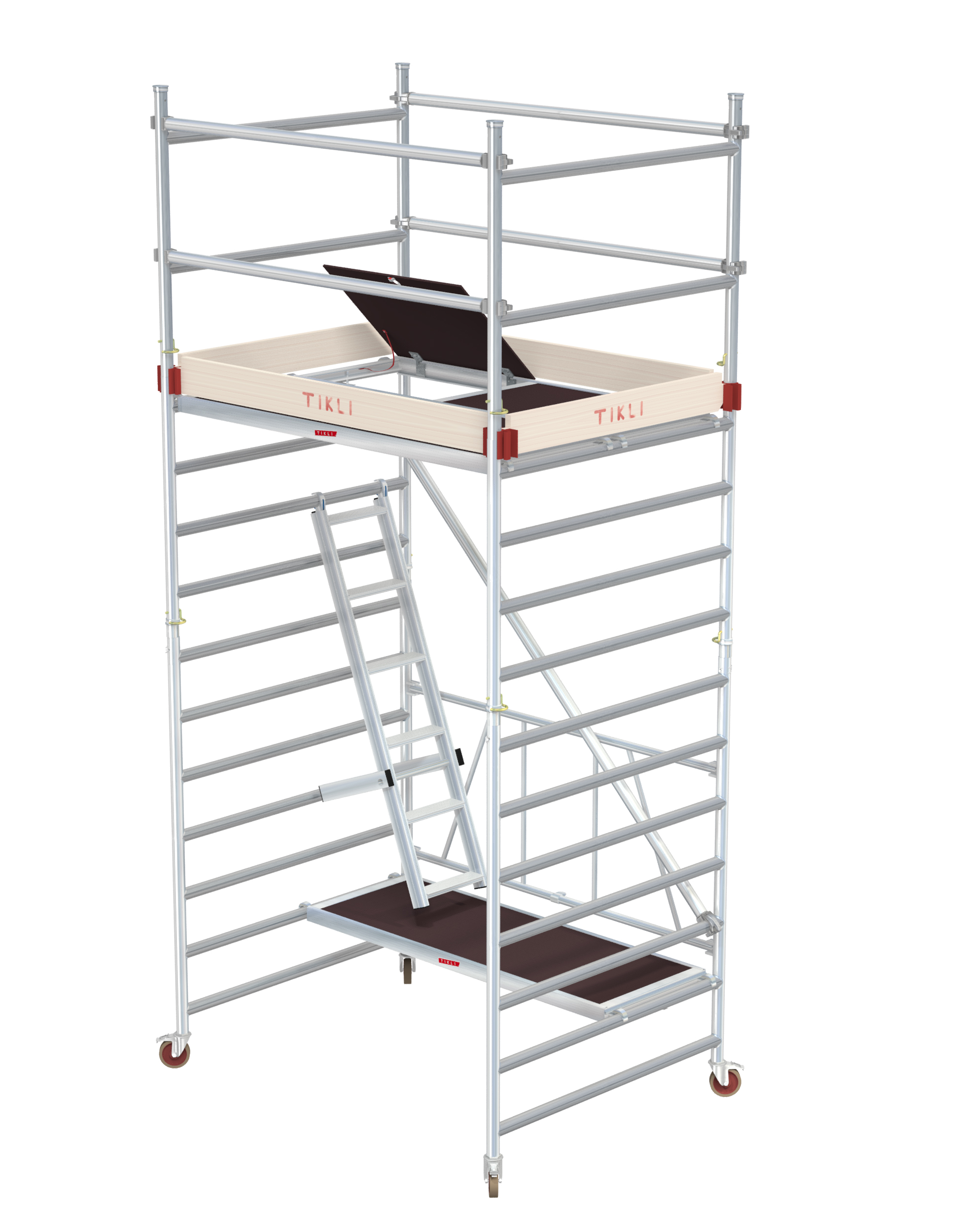 Perusosa sisältää 178cm pitkiä työtasoja 2 kpl, toinen luukullisena. Tasokorkeus 1,8m - työskentelykorkeus max 3,8m. Kätevä korottaa 1m/2m päätyelementeillä aina 12m tasokorkeuteen asti. Huomio tukijalat lisävarusteeksi tasokorkeuden ylittäessä 3,5m sekä kaidesetti viimeistään 2m tasokorkeudessa. Mikäli paljon ulkokäyttöä, suosittelemme vakiopyörien tilalle säätöpyörät. Ammattikäytössä huomioi lisäksi askelmatikas nousuun VnA 205/2009 asetuksen mukaisesti.